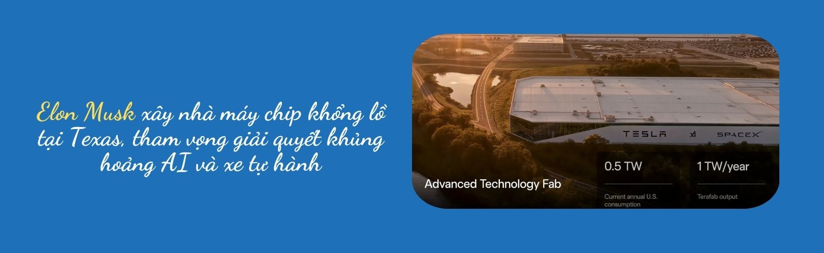 Elon Musk vừa công bố kế hoạch xây dựng hai nhà máy sản xuất chip bán dẫn tại Austin, Texas, nhằm phục vụ nhu cầu ngày càng tăng của Tesla và SpaceX trong lĩnh vực trí tuệ nhân tạo, xe tự hành và công nghệ không gian. Dự án mang tên Terafab được kỳ vọng sẽ trở thành một trong những trung tâm sản xuất chip tiên tiến nhất thế giới với tổng diện tích lên tới 100 triệu feet vuông, tương đương quy mô của một siêu tổ hợp công nghiệp, và được định giá gần 25 tỷ USD theo nhiều nguồn truyền thông quốc tế.